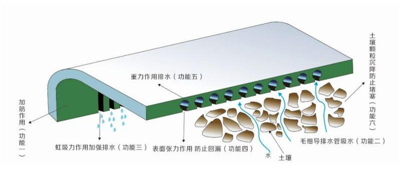 本產(chǎn)品采用PVC高密度聚合材料,具有較好的韌性,埋于土中可以起到拉結(jié)土壤的作用(功能一);且一反傳統(tǒng)改采用密集溝槽,內(nèi)大外小的設(shè)計,且埋設(shè)時溝槽面向下,而使水流由下往上倒吸進(jìn)入毛細(xì)導(dǎo)水管(功能二);如此一來土壤顆粒因重力自然沉淀不致隨同水流進(jìn)入毛細(xì)導(dǎo)水管內(nèi),同時也不會在進(jìn)水槽溝附近產(chǎn)生淤積現(xiàn)象(功能三);但是內(nèi)部溝槽既能進(jìn)水,同時也造成漏水之后果,此時毛細(xì)防排水板則利用表面張力使水在溝槽上產(chǎn)生封閉效果不回漏(功能四);當(dāng)水進(jìn)入時,毛細(xì)現(xiàn)象會自然而然對土壤中的水分產(chǎn)生抽吸的效果,直到灌滿并以重力流向外排放(功能五);當(dāng)水流到達(dá)出口將因落差產(chǎn)生虹吸作用,進(jìn)一步對土壤內(nèi)部產(chǎn)生負(fù)壓,大幅增加吸排水效果(功能六)。